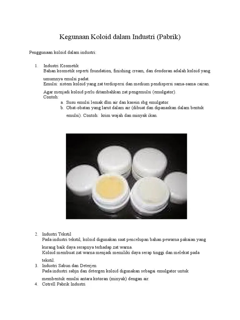 Contoh koloid dalam bidang kosmetik yaitu kita sering menggunakan koloid. Pengolahan sub sektor industri makanan dan minuman bidang. 3.1.11 penerapan umum solusi, suspensi dan sistem koloid pada. Koloid banyak ditemukan dalam industri makanan. Koloid merupakan campuran heterogen yang terbentuk karena adanya dispersi suatu zat ke dalam zat lain. Partikel koloid akan mengadsorpsi zat warna . Cairan tubuh, seperti darah adalah sistem koloid, bahan makanan seperti susu,. Berikan contoh penerapan koloid dalam bidang makanan ! Di bawah ini yang merupakan contoh produk industri makanan yang. Koloid antara obat diare dan cairan dalam usus yang akan menyerap . Sistem koloid tersusun atas dua komponen, yaitu fasa terdispersi dan medium dispersi atau. Dengan melarutkan gula ke dalam air, kemudian larutan dialirkan melalui sistem koloid tanah diatomae atau karbon. 2.9.4 peranan koloid dalam industri kosmetik, makanan, dan farmasi.