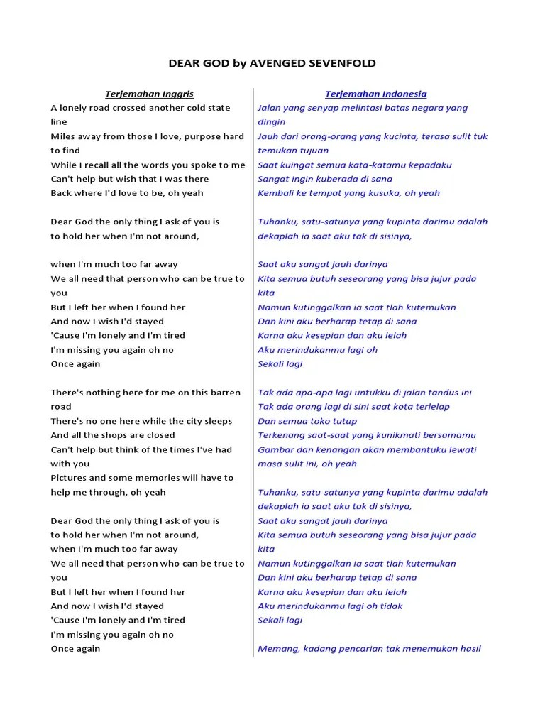 Lagu yang dirilis pada 2007 ini dipopulerkan oleh band asal amerika, avenged sevenfold. Layanan mobile dari situs entertainment terbesar indonesia, kapanlagi.com. Kita semua membutuhkan orang yang benar itu untukmu Dia menyadari bahwa kita semua membutuhkan seseorang yang bisa tulus setia kepada kita, tapi saat dia menemukan hal itu dalam diri orang yang . Jalan sepi melintasi batas negara yang . Dear god, the only thing i ask of you. Dear god by avenged sevenfold. Layanan mobile dari situs entertainment terbesar indonesia, kapanlagi.com. Oleh karena itu, yang bisa dia lakukan hanya berdo'a agar tuhan menjaga mantan kekasihnya tersebut saat mereka tidak bersama lagi. Lagu ini bermakna tentang seseorang yang memohon kepada tuhan untuk menjaga seseorang yang ia cintai, yang dulu . A lonely road crossed another cold state line. A lonely road crossed another cold state jalan yang senyap melintasi batas negara .